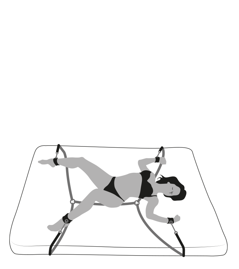 Die Bettfesseln bestehen aus Gurten und Fesseln. Die Handhabung ist sehr einfach. Die Gurte werden unter dem Bett durchgeführt, wo zwei der Gurte in H-Form miteinander verbunden sind. An den Enden befinden sich die Fesseln, mit denen Sie Partner oder Partnerin ans Bett fesseln können. Die Handfesseln werden mit Klettverschluss verschlossen und sind weich gefüttert. Die Gurte haben jeweils eine Länge von 1,50 m und sind für alle Betten geeignet.