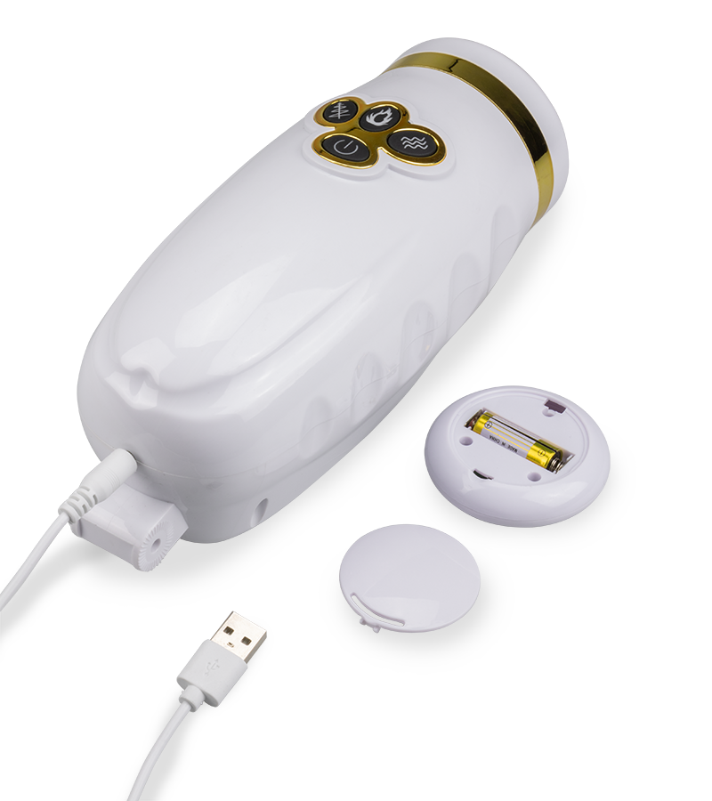 7.  Drücken Sie die mittlere Taste, um die Heizfunktion des Dildos einzuschalten. Hinweis: Es dauert etwa 15 Minuten, bis sich der Dildo aufgeheizt hat.