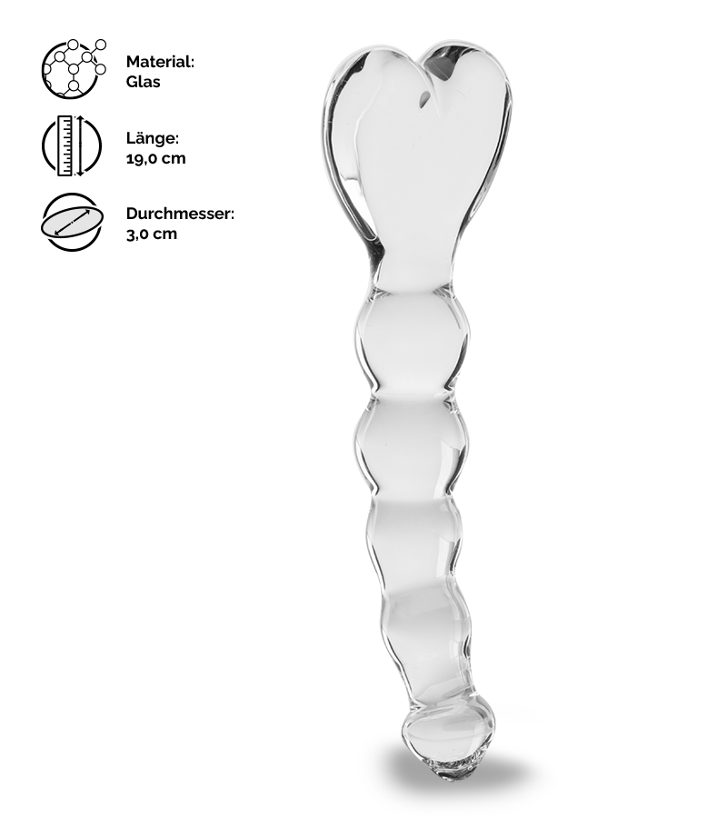 Der Dildo ist komplett transparent. Mit der leicht gebogenen Form und den fünf übereinanderliegenden Kugeln wird die G-Punkt-Massage mit diesem Dildo aus Glas perfekt. Oben schließt der Dildo mit einem hübschen Herz ab. Das sieht nicht nur schön aus, sondern dient auch als praktischer Griff für Sie selbst oder für Ihre Partnerin oder Ihren Partner, wenn Sie den Dildo zu zweit verwenden möchten. Das verwendete Material punktet mit zahlreichen tollen Eigenschaften. Glas ist hypoallergen und sorgt für eine sehr glatte und damit gleitfreudige Oberfläche. Außerdem kann Glas ganz leicht die Temperatur ändern, indem Sie es vor dem Gebrauch in kaltes oder warmes Wasser legen.