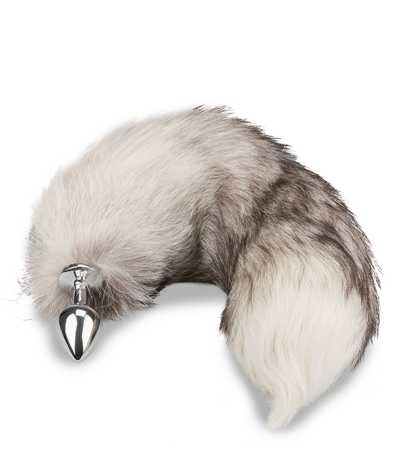 Der grau-weiße Fuchsschwanz-Buttplug mit echtem Fell ist unglaublich weich.