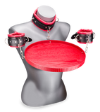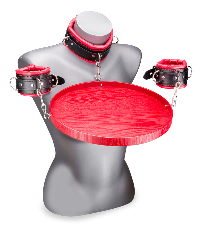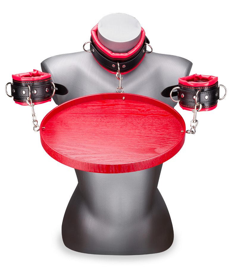 Dieses BDSM-Accessoire besteht aus zwei Fesseln für die Handgelenke und einem Halsband. Handfesseln und Halsband sind an einem Holztablett befestigt. So zwingen Sie Ihren Partner oder Ihre Partnerin dazu, Sie zu bedienen. Die Handfesseln und das Halsband sind aus Kunstleder hergestellt, auf der Innenseite weich gepolstert und in der Größe verstellbar.