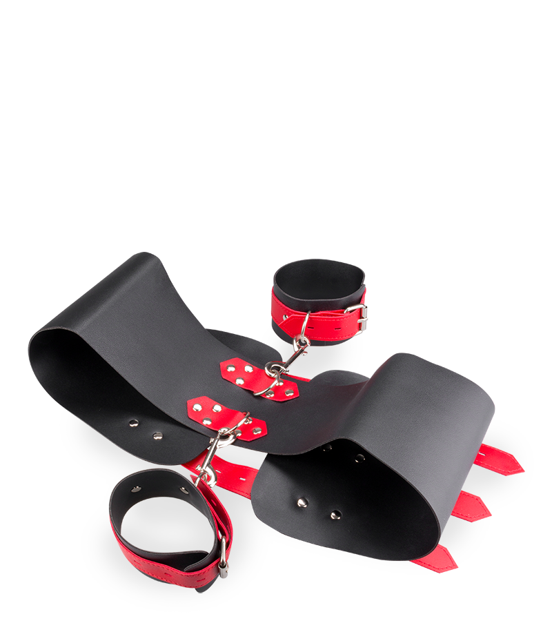 Der Gürtel der Fessel wird um die Hüfte gelegt. Befestigen Sie dann die beiden Handfesseln für die Handgelenke an dem Gürtel, um die Hände auf Höhe der Hüfte zu fixieren und die Bewegungsfreiheit von Partnerin oder Partner einzuschränken. Die Fessel ist aus Kunstleder gefertigt und mit Metall-Elementen versehen. Sie ist solide und schick zugleich.
