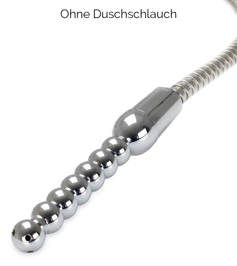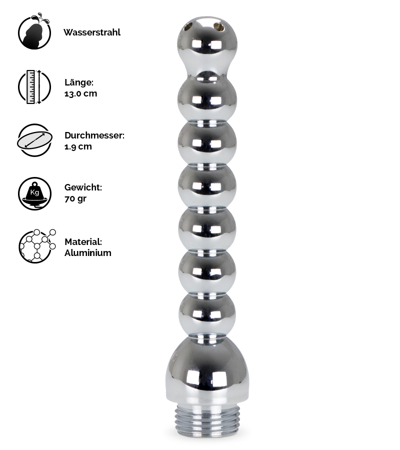 Sie möchten zuhause eine Analdusche machen und suchen nach einem passenden Accessoire? Dann ist dieser Analduschstab aus Aluminium vielleicht für Sie der richtige Aufsatz für Ihren Duschschlauch. Der Schaft besteht aus übereinanderliegenden Kugeln. Die unterste hat den größten Durchmesser und dient als Stopper. Daran schließen sich sechs Kugeln an. Die Spitze ist ebenfalls rund und mit vier kleinen Öffnungen versehen, durch das Wasser in Ihren Analbereich gespült wird. Mit dem Duschaufsatz für Analduschen reinigen Sie Ihr Hintertürchen gründlich, sodass Sie perfekt auf anschließenden Analverkehr vorbereitet sind. Neben der Reinigung darf natürlich auch der Spaß nicht zu kurz kommen. Durch die Kugelstruktur des Schafts stimuliert und massiert der Intimduschstab Ihr Hintertürchen intensiv.