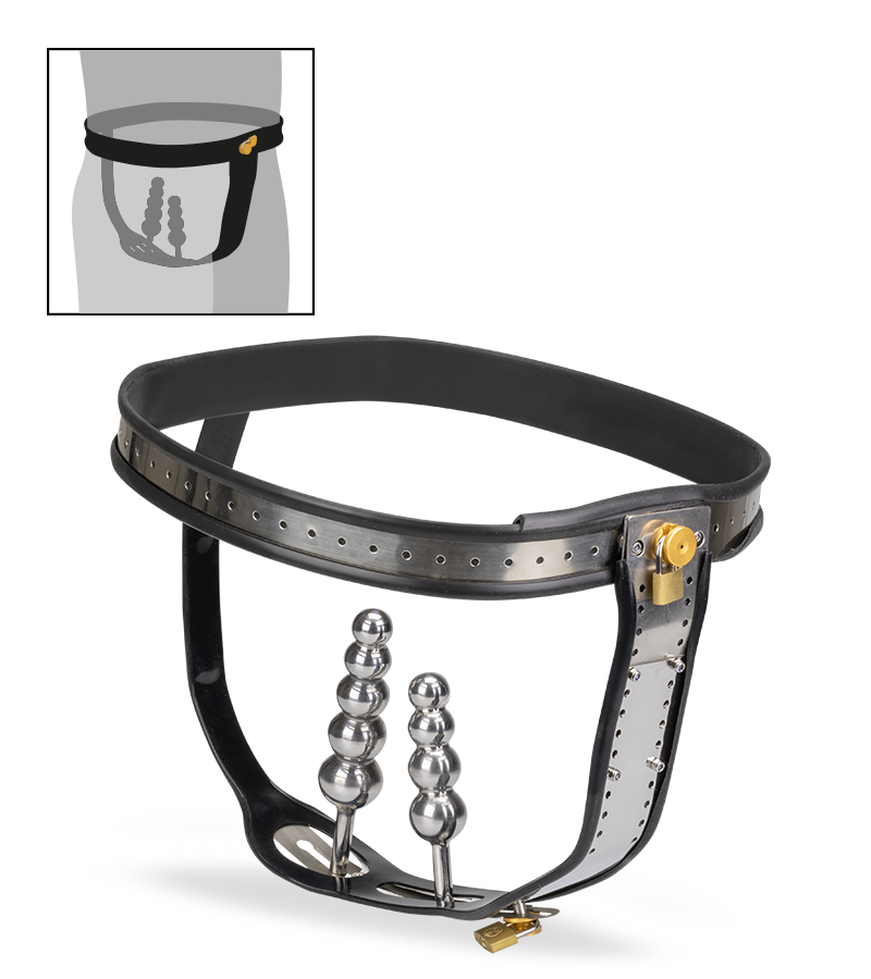 Ein Keuschheitsgürtel ist das perfekte Hilfsmitttel für eine totale sexuelle Unterwerfung. Der Keuschheitsgürtel Convent bietet Ihnen nicht nur den klassischen Keuschheitsgürtel, sondern auch verschiedene Zubehörteile, unter anderem zwei verschiedene Analplugs mit unterschiedlichen Maßen. Während der eine Plug eine Schaftlänge von 10,5 cm und einen Durchmesser von 3,3 cm hat, hat der andere Plug eine Schaftlänge von 8,3 cm und einen Durchmesser von 2,8 cm. Sie können den Keuschheitsgürtel mit einem Plug oder mit beiden Plugs gleichzeitig verwenden. Der Keuschheitsgürtel ist aus Metall und Latex gefertigt und ist in der Größe verstellbar. Im Lieferumfang sind zwei Schlösser mit den entsprechenden Schlüsseln enthalten.