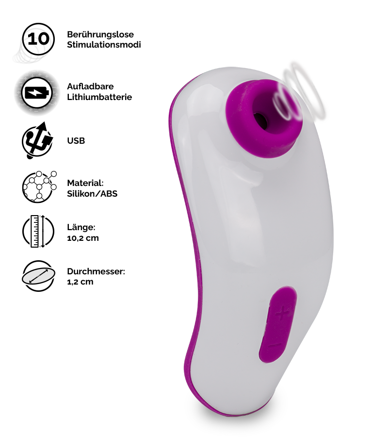 Halten Sie einfach den kleinen Aufsatz aus Silikon an Ihre Klitoris und genießen Sie die sanften Schwingungen und Druckwellen. Ohne die Klitoris direkt zu berühren sorgt dieses Sexspielzeug mit Druckwellen und Schwingungen für unvergessliche Empfindungen! Um sich an die Wünsche aller Frauen anzupassen, die mal zärtlich sanft und mal intensiv berührt werden möchten, bietet Ihnen dieser Druckwellenstimulator eine Auswahl von 10 Intensitätsstufen. Der Druckwellenstimulator ist klein und leicht und folgt Ihnen überall dorthin, wo Sie lustvolle Momente erleben möchten. Wenn er schwächelt können Sie ihn mit dem mitgelieferten USB-Magnetladekabel wieder aufladen.