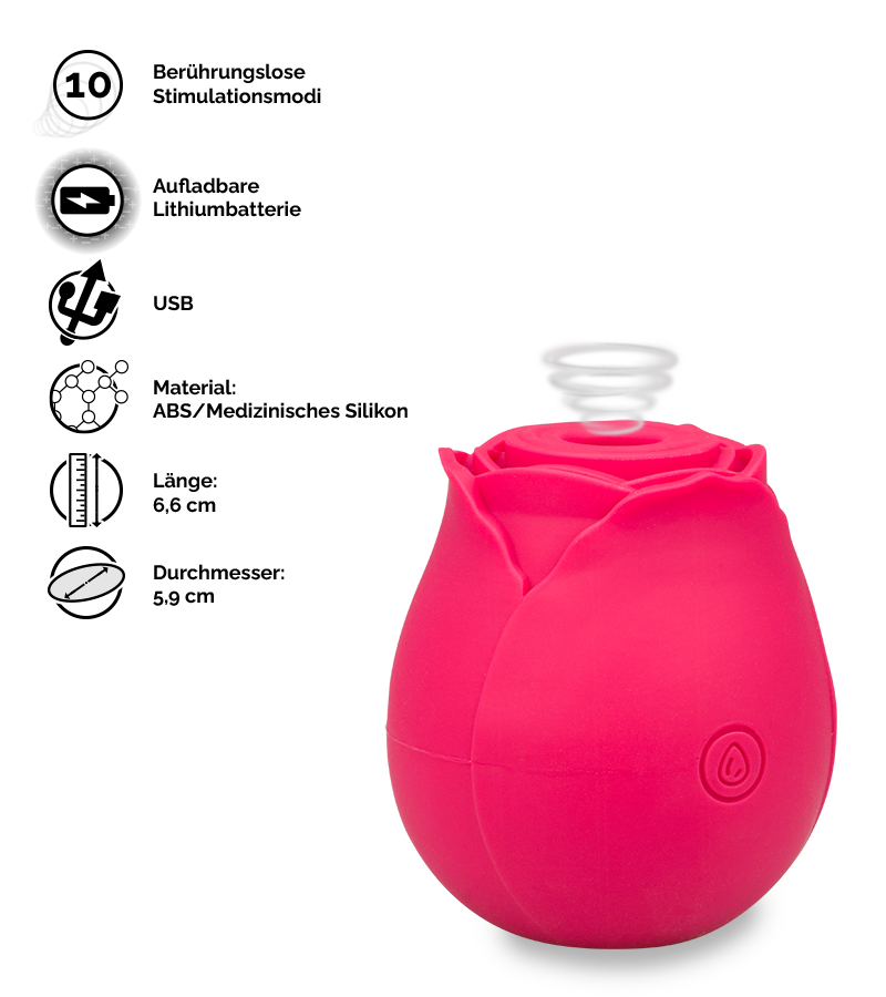 Das kleine Sexspielzeug sieht aus wie eine Rosenknospe und bringt einen Hauch von Eleganz in Ihre Sextoy-Sammlung. Der Klitorisstimulator ist aus ABS und medizinischem Silikon gefertigt. Dadurch ist die Oberfläche seidig weich und angenehm. Der Stimulator ist einfach zu bedienen und bietet auf Knopfdruck 10 verschiedene Stimulationsmodi. Die Düse wird einfach auf der Klitoris positioniert und stimuliert berührungslos mit pulsierenden Druckwellen. Die verschiedenen Modi erlauben es Ihnen, Intensität und Rhythmus der pulsierenden Druckwellen auf Ihre Lust abzustimmen.
