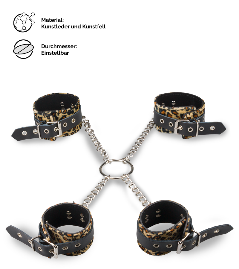 Lassen Sie sich fesseln oder fixieren Sie Partner oder Partnerin mit den Fesseln für Hände und Füße. Die Fesseln sitzen bequem an Handgelenken und Fußgelenken und schränken die Bewegungsfreiheit ein. Ein Fesselkreuz aus einer Metallkette verbindet alle vier Fesseln miteinander. Es kann auf der Vorderseite oder auf der Rückseite des Körpers getragen werden. Die Fesseln sind aus Kunstleder und Kunstpelz gefertigt und haben einen sexy und wilden Panther-Print. Jede Fessel ist einzeln verstellbar und passt sich verschiedenen Durchmessern an.