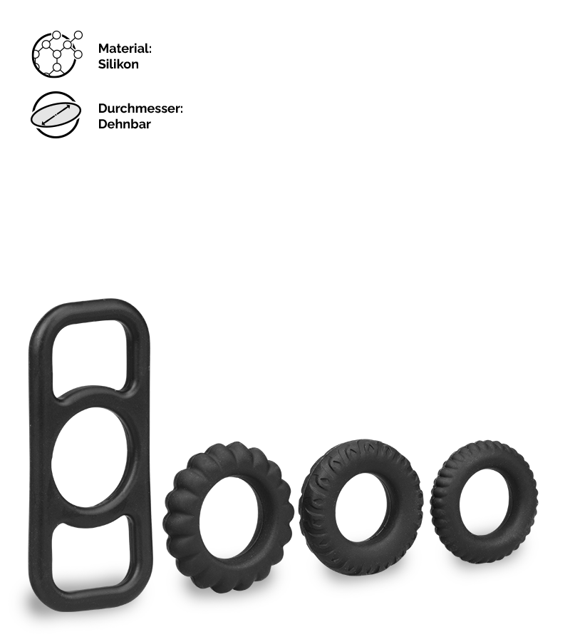 Die vier Penisringe aus dem Set sind aus Silikon gefertigt und damit sehr elastisch. Sie passen sich an unterschiedliche Penisdurchmesser an. Sie lassen sich sehr gut überziehen und steigern durch einen sanften Blutstaueffekt für eine verbesserte sexuelle Leistungsfähigkeit. Sie bekommen eine härtere Erektion und mehr Ausdauer, sodass Sie länger gemeinsam genießen können und Sie später kommen. Die Penisringe im Set können Sie alleine oder zu zweit verwenden.