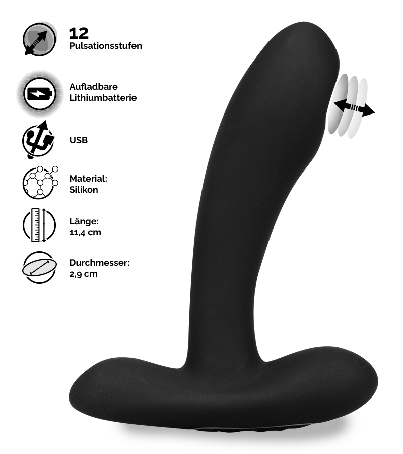 Der Prostatastimulator mit der ergonomischen Form gibt an der Spitze absolut göttliche pulsierende Impulse ab. Damit eröffnet er Ihnen eine ganz neue Herangehensweise an die Stimulation von Prostata und P-Punkt. Die pulsierenden Impulse können Sie in 12 unterschiedlichen Modi genießen. Die Modi unterscheiden sich in Rhythmus und Intensität. Durch die anschmiegsame Oberfläche gleitet der Pulsator ganz leicht in Ihr Hintertürchen.