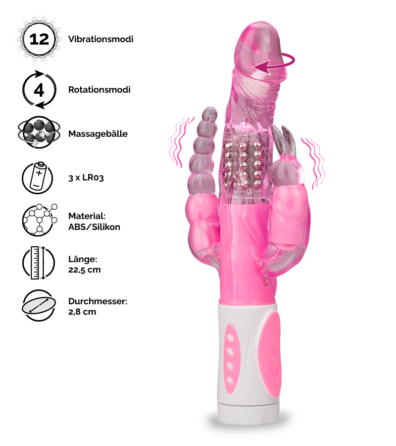 Mit seiner Form und den zahlreichen Funktionen stimuliert dieses Sexspielzeug drei erogene Zonen gleichzeitig. Der Schaft des Vibrators verfügt über zahlreiche Details im Relief. Wenn er in der Vagina seine Rotationsbewegung ausführt, reibt die Reliefstruktur sanft an Vaginalwand und G-Punkt. Gleichzeitig verwöhnen die innenliegenden Perlenstränge Ihren Intimbereich mit einer sinnlichen Massage. Neben dem Klitorisreizer im Bunny-Design verfügt dieser Vibrator zusätzlich über einen Reizarm in Form einer Analkette, der in Ihren Anus eingeführt wird. Der Rabbit-Vibrator bietet Ihnen zwölf unterschiedliche Vibrationsmodi und 4 Rotationsstufen, die Ihre Lust und Leidenschaft wecken.