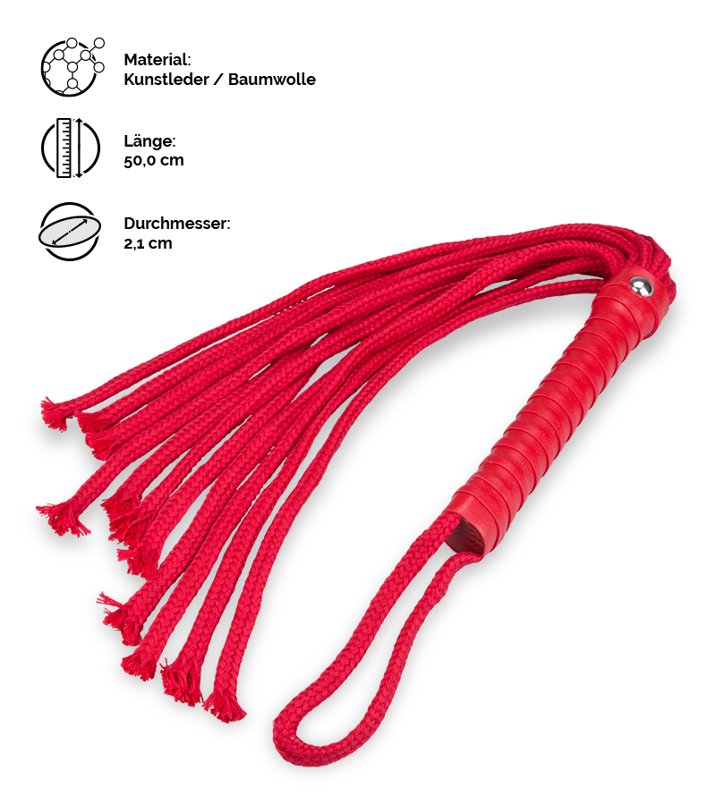 Die rote Riemenpeitsche ist 50 cm lang und hat einen Durchmesser von 2,1 cm.