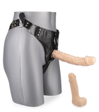 Bei dem Umschnallgurt aus Kunstleder mit zwei unterschiedlich großen Naturdildos können Sie vorher wählen, ob Sie lieber den kleineren oder den größeren der beiden Dildos am Gurt befestigen möchten. Der größere Dildo hat einen leicht gebogenen Schaft, während der andere Dildo über pralle Hoden verfügt. Der gewünschte Dildo wird einfach am Befestigungssystem des Gurts befestigt. Der Gurt selbst ist elastisch und lässt sich sehr gut tragen.