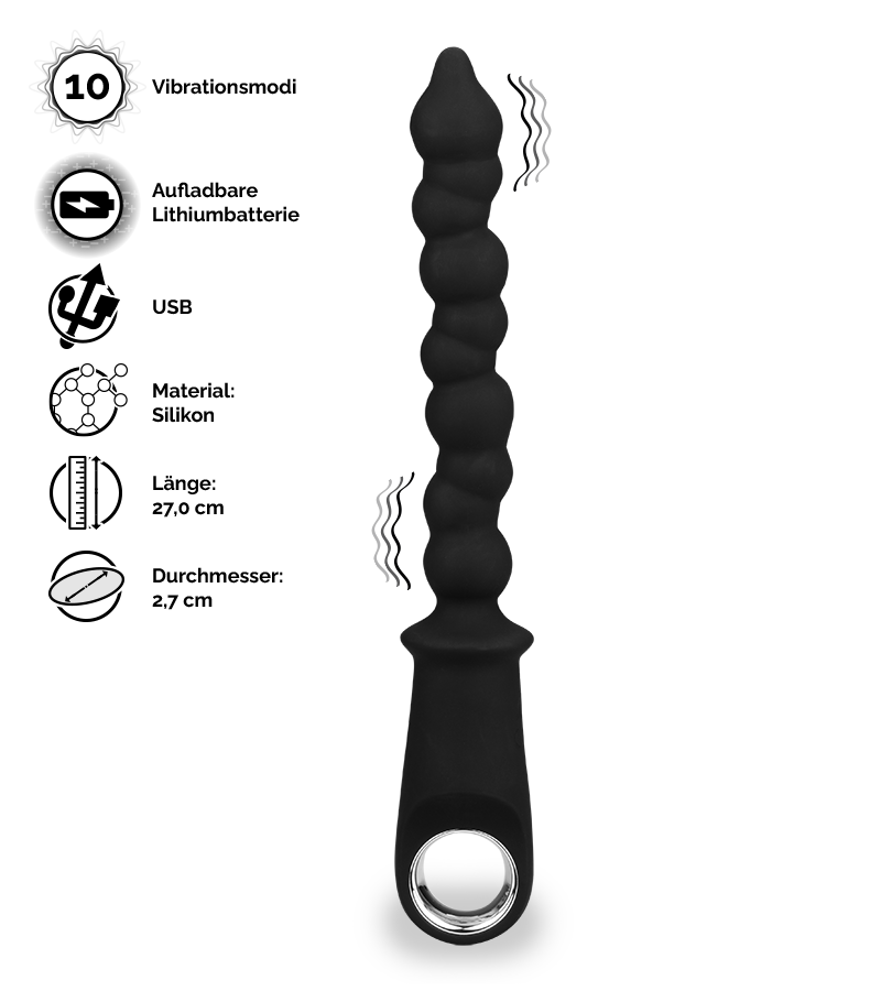 Die Analkette stimuliert intensiv. Sie können aber selber entscheiden, wie tief und wie schnell Sie die Analkette einführen möchten. Daher eignet sich dieses Sexspielzeug sowohl für Einsteiger als auch für erfahrene Nutzer von Anal-Toys. Dank des mittleren Durchmessers und der spitz zulaufenden Spitze lässt sich die Analkette gut einführen. Lassen Sie die Analkette dann nach und nach in Ihr Hintertürchen gleiten, bis Sie sich sicher genug fühlen, um sie vollständig einzuführen. Über die komplette Schaftlänge der beweglichen Analkette zieht sich eine Reliefstruktur, die die Analwand massiert. Zusätzlich können Sie einen der 10 vorhandenen Vibrationsmodi auswählen und mit der Intensität der Vibrationen variieren.