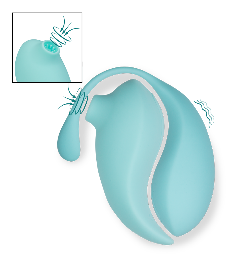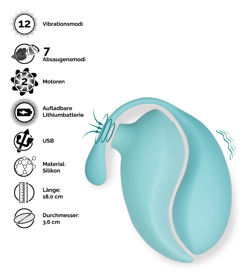 Das Vibroei ist perfekt geformt. Es schmiegt sich für genussvolle Massagen an Ihren G-Punkt und versorgt diese erogene Zone mit kribbelnden Vibrationen in 12 Modi. Und weil doppelt immer besser hält gibt es zu diesem Vibroei eine kabellose Fernbedienung dazu, die auf Ihren Wunsch sanft an der Klitoris saugt. Der Aufsatz des Klitorissaugers ist mit kleinen weichen Silikonnoppen versehen, die an der Klitoris kitzeln. Wenn Sie auf die Stimulation der Klitoris verzichten können und lieber Ihren Partner oder Ihre Partnerin in Ihr lustvolles Spiel einbeziehen möchten, können Sie die Fernbedienung mit Klitorissauger auch abgeben und sich von fremdbestimmten Vibrationen überraschen lassen.
